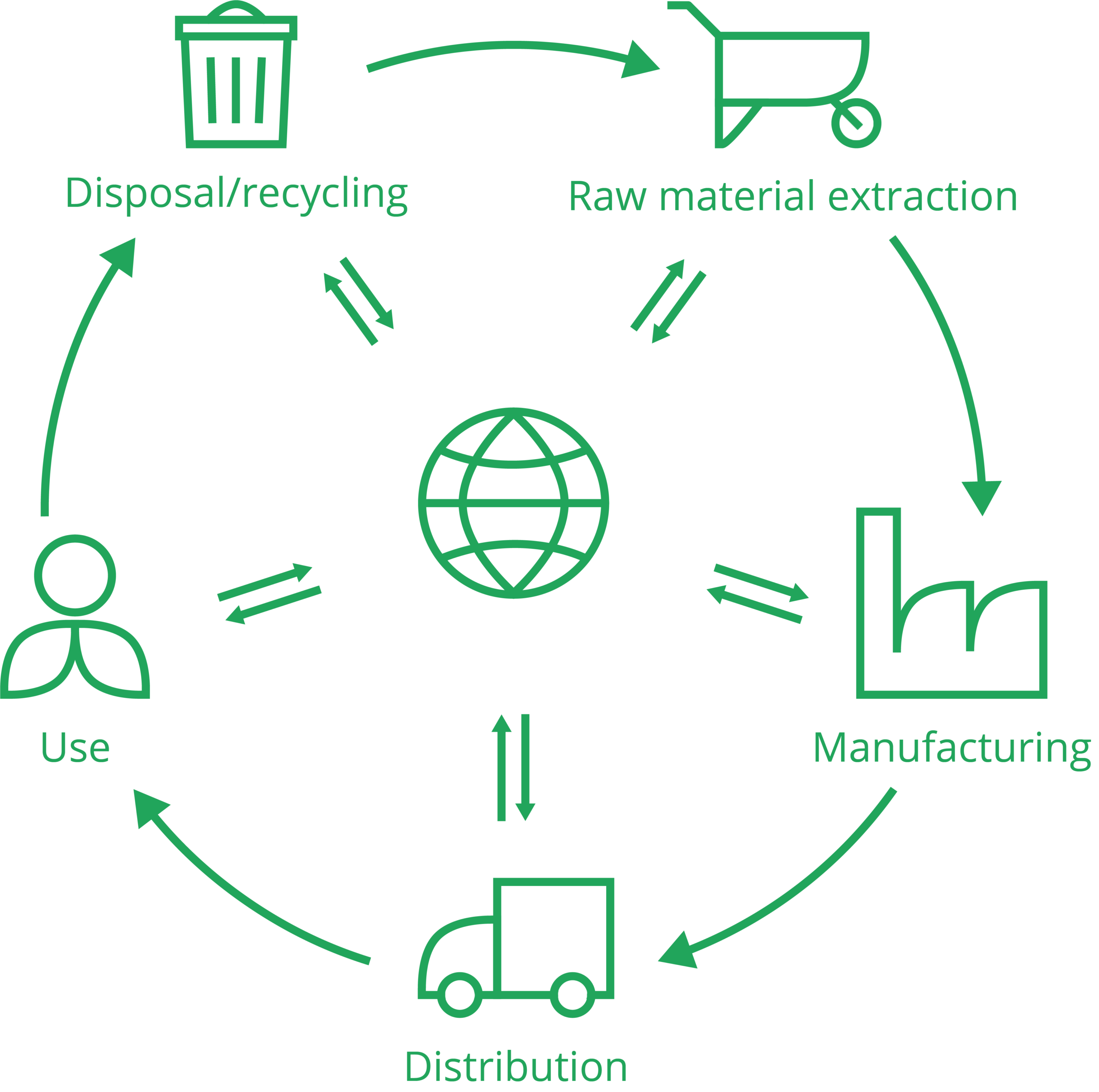 All stages of a product system, these are consecutive and interlinked and go from raw material to disposal. This is sometimes called a supply-chain.