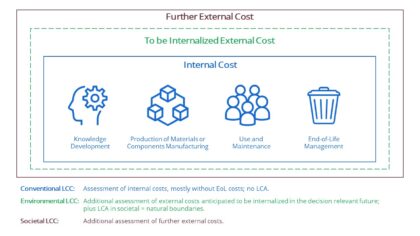 Basically, an eLCC analysis has a similar structure as an LCA that is conducted in parallel and has the same functional unit and consistency in its scope. The life cycle and system boundaries need to be equivalent, but not necessarily the same as different processes may have different relevance for the environment and for the cost part. For example, research and development will rarely be considered in an LCA, while it is commonly taken into account in LCC. Further, eLCC can be performed from the viewpoint of different “life cycle actors” (as producers, product buyers, or end-of-life actors).